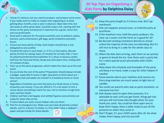 This document provides a comprehensive guide for organizing the perfect kids' party, featuring 20 essential tips including preparation, budgeting, and scheduling activities. It emphasizes the importance of themes, food planning, and suitable games to ensure a fun and memorable experience for children. The guide also includes advice on invitations, decorations, and handling emergencies to streamline the party planning process.