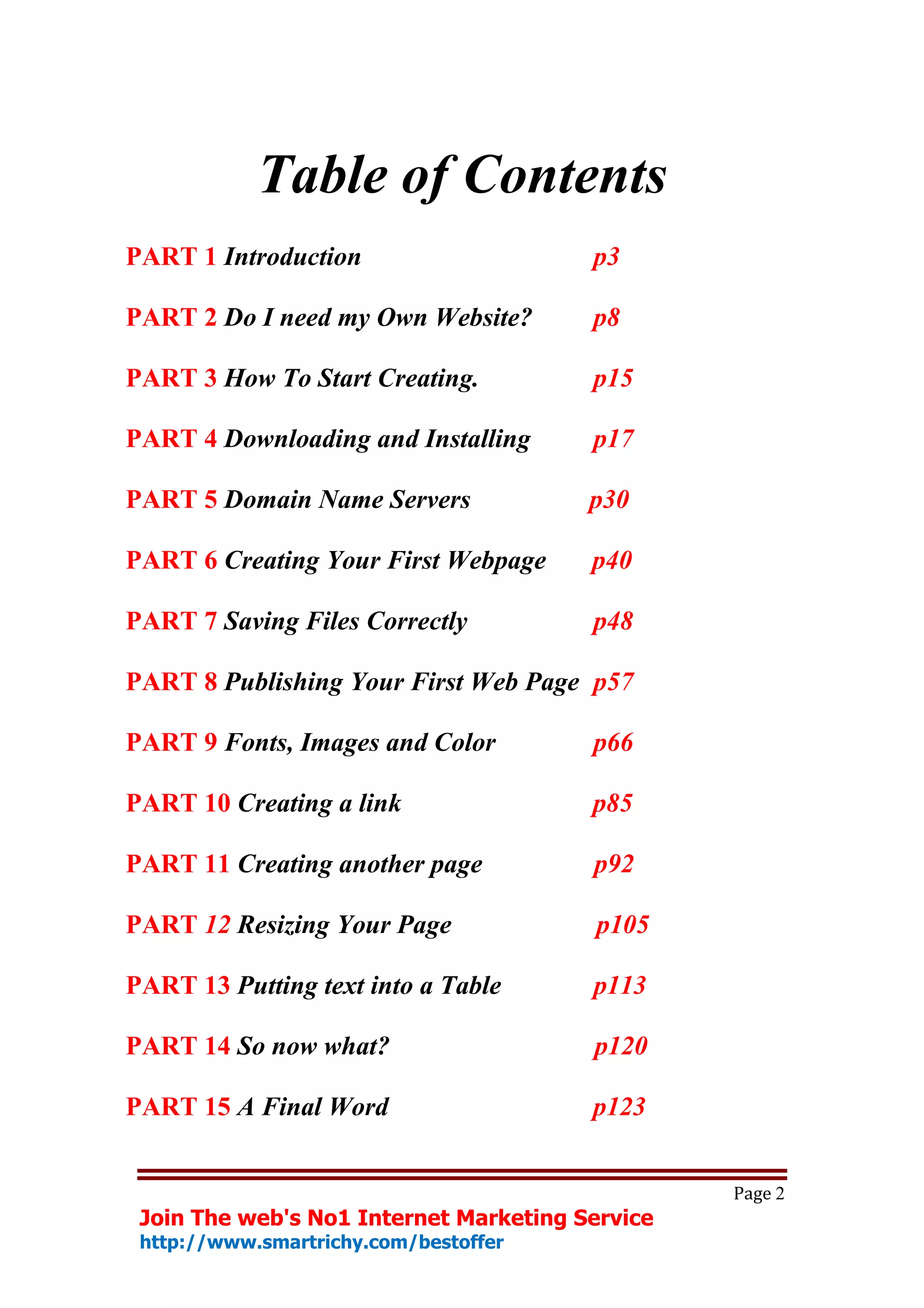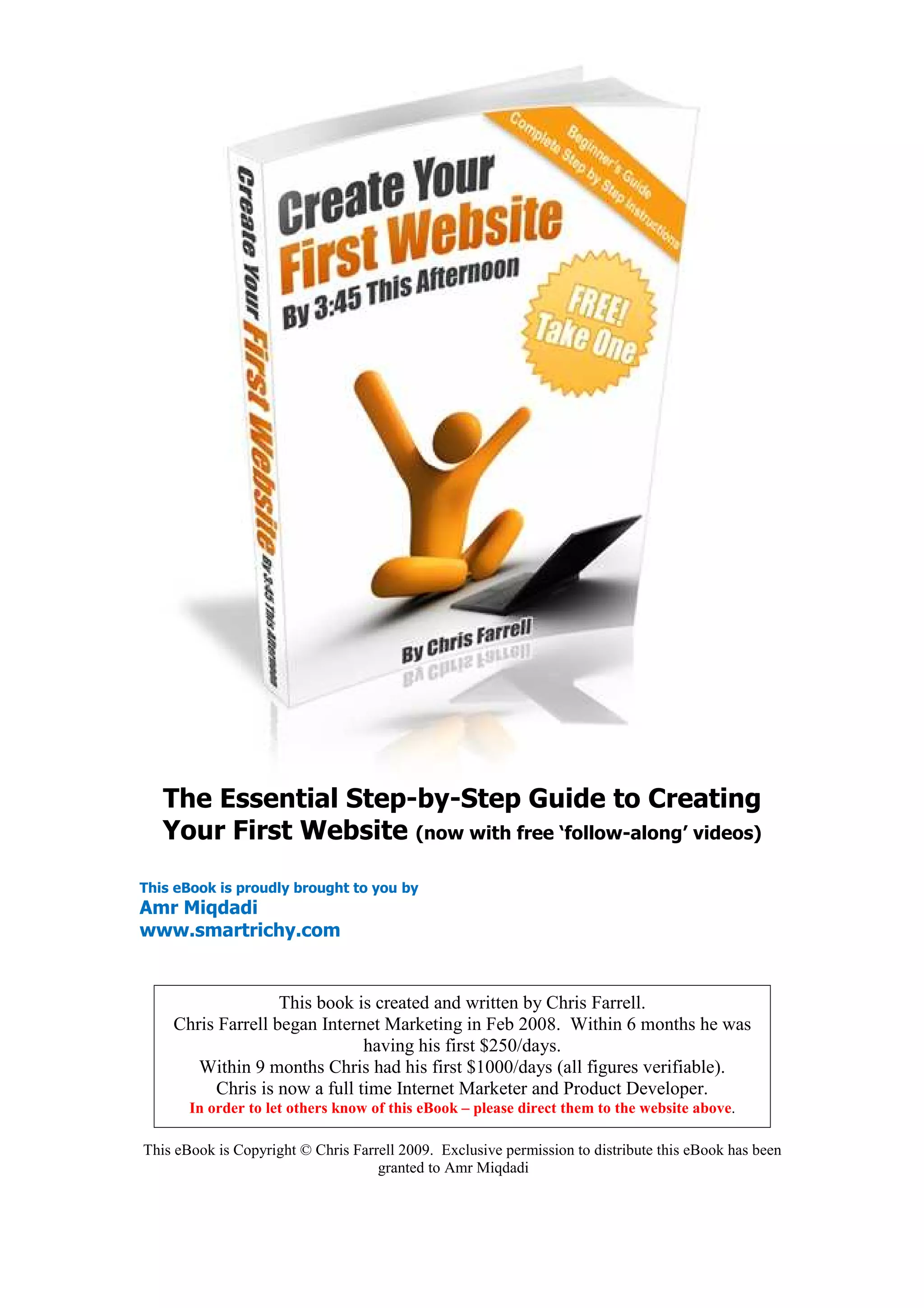 This document provides a step-by-step guide to creating a basic website. It begins by explaining that having your own website is essential for an online business to succeed. While free affiliate websites are available, they do not provide full control and require additional marketing efforts. The document then guides the reader through setting up their own free-hosting website using basic HTML coding. By following the steps, a reader can create a functional three-page website with links between pages to get their first online presence.