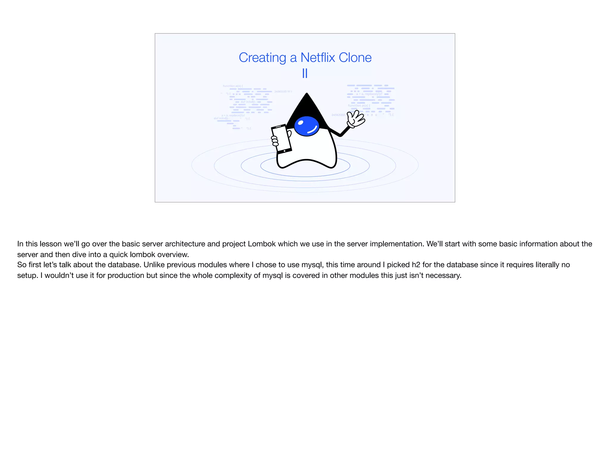 This document describes the creation of a Netflix clone, focusing on the server architecture and the use of Project Lombok to simplify code development. It highlights the choice of H2 database for ease of use over MySQL, particularly for non-production environments, and discusses the implementation of minimal web services without authentication complexities. The document provides insights into Lombok's ability to reduce boilerplate code, making server code more concise and efficient.