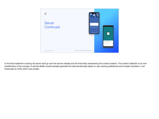 This document discusses the final installment of creating a Netflix clone, focusing on service classes and the content creation entity. It details the structure of the content collection, which includes various lists like popular, my list, and recommended content, and describes the web service setup to retrieve this content through a REST API. Additionally, it explains the database initialization process and how resources are loaded for media content management.