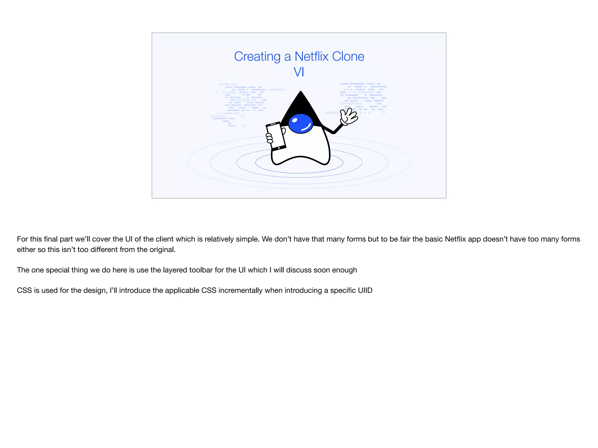 The document discusses the creation of a Netflix clone's user interface, emphasizing its simplicity and the use of layered toolbars for navigation. It introduces CSS for design elements and outlines key components, including splash and home forms with specific functionalities like displaying popular titles and implementing navigation elements. Additionally, it covers image handling and layout considerations to ensure adaptability across different device resolutions.