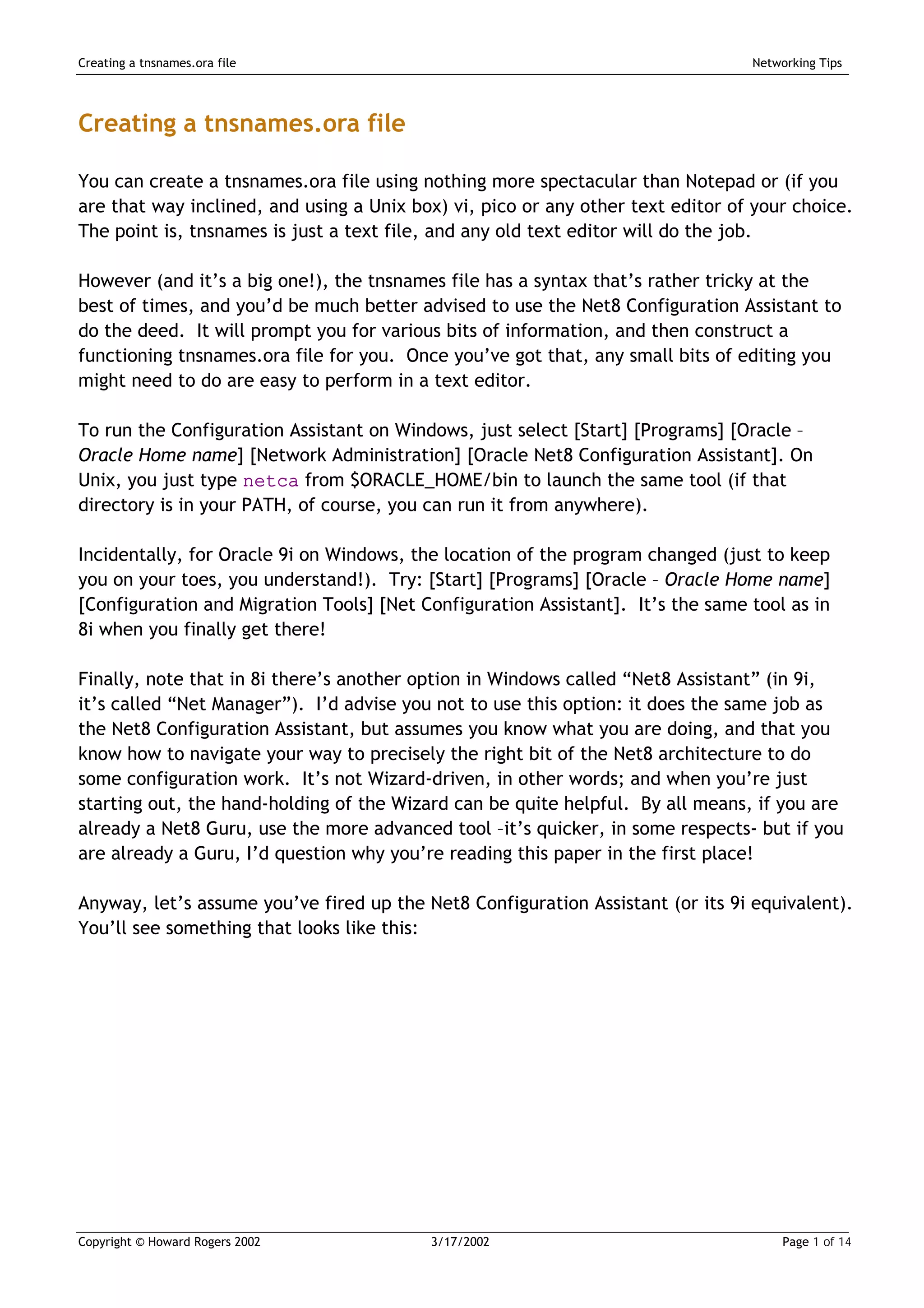 The document provides a comprehensive guide on creating a tnsnames.ora file, which is essential for Oracle database connectivity, using text editors like Notepad or vi. It emphasizes using the net8 configuration assistant for ease and accuracy, outlines the steps for defining service names, networking protocols, and listener configurations, and offers troubleshooting tips for common connection issues. Additionally, it suggests ways to streamline user connections by customizing service aliases in the tnsnames.ora file.
