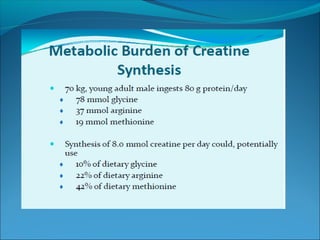 This document discusses creatine, creatinine, and creatine kinase (CK). It explains that creatine is synthesized in the liver and kidneys and stored in muscles, where it is converted to phosphocreatine to provide energy. Creatinine is a breakdown product of creatine and phosphocreatine. Serum creatinine levels indicate kidney function, while CK levels indicate damage to heart and skeletal muscles. The document outlines creatine synthesis and breakdown, the roles and clinical importance of creatinine and CK, and how they are used as biomarkers.