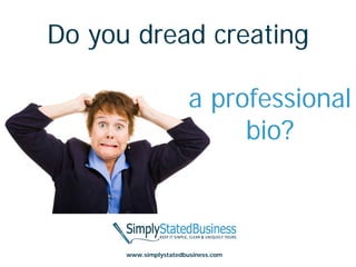 The document provides tips on creating an effective professional bio. It recommends including your background and credentials to establish credibility, as well as uniqueness to stand out. The bio should tell a story with an attention-grabbing opening, build on experience and accomplishments, and conclude with personal details. Examples are given throughout to illustrate these components for crafting a compelling bio in 3 sentences or less.