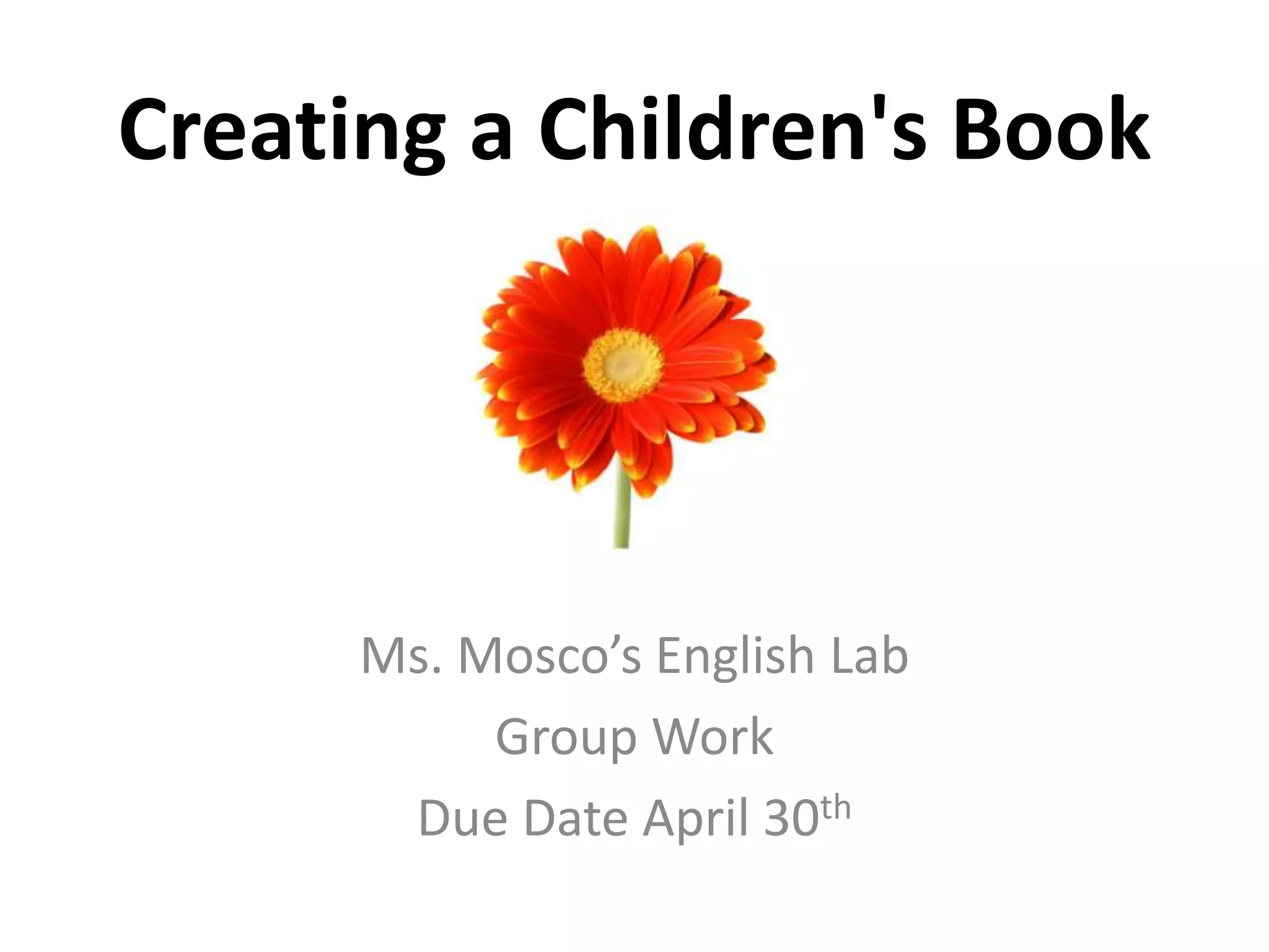 This document provides steps for creating a children's book, with the final step being to have fun making your own personal children's book, and noting the teacher will be available to help. It outlines a project in an English lab class due on April 30th where students will work in groups to create children's books.