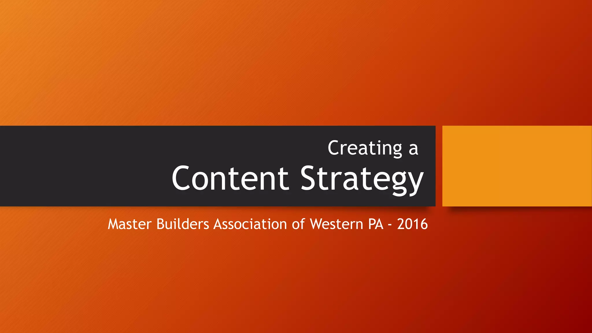 The document outlines a content marketing strategy for the Master Builders Association of Western PA, emphasizing the importance of creating valuable content to attract and retain a targeted audience. It presents a four-step process for developing a content strategy: setting objectives, defining buyer needs, execution and amplification, and measurement of metrics. Key elements include understanding buyer personas, identifying audience needs, and utilizing various platforms for content distribution and engagement.