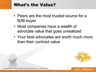 Creating a culture of referenceability enhances B2B sales by leveraging customer advocates, thus differentiating offerings and boosting credibility. Essential for this culture is C-level support and accountability across the organization, alongside training for employees to identify and utilize advocates effectively. As advocacy increases, it fosters a cycle of engagement and growth that benefits both employees and the organization.