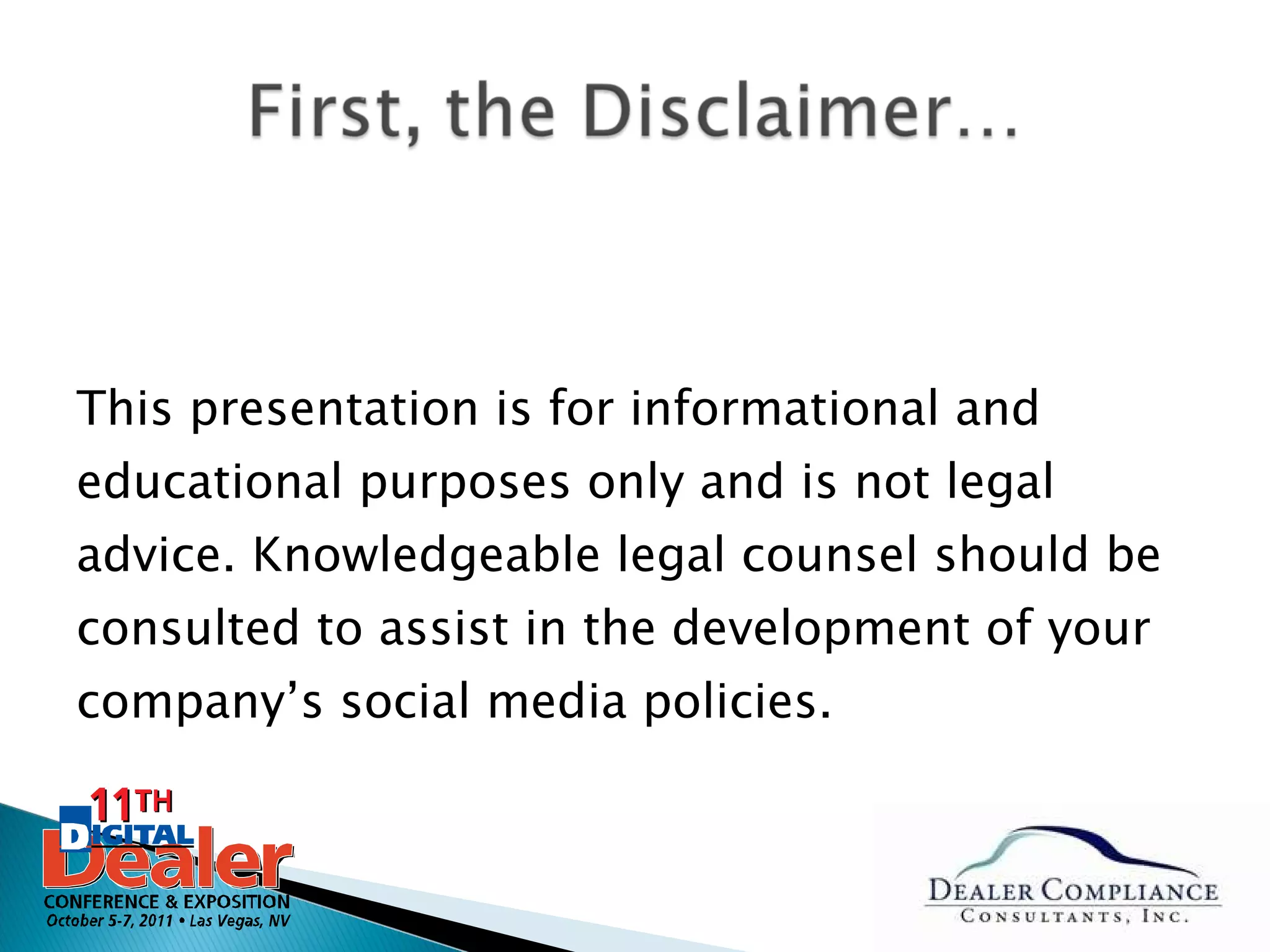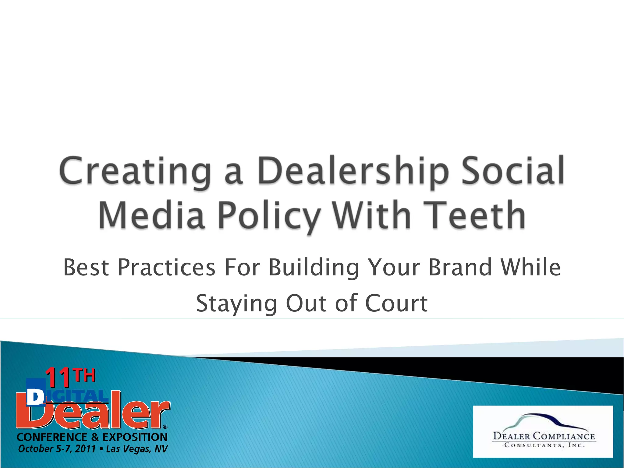 This document provides guidance on developing an effective social media policy to build a brand while avoiding legal issues. It discusses how social media policies should cover appropriate employee use, potential legal risks, and guidelines for using social media in hiring decisions. It also summarizes laws around discrimination, privacy, overtime pay, harassment, and prohibiting fake reviews or disclosing relationships with reviewers.