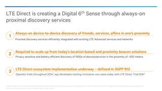 The document discusses LTE Direct, a technology enabling always-on device-to-device discovery of nearby friends, services, and offers, which integrates efficiently with existing LTE networks. It highlights the potential for scalable, privacy-sensitive, and battery-efficient proximity services, making it suitable for various applications like retail, social media, and location-based advertising. The implementation of LTE Direct is underway, with trials being conducted and a framework established for interoperability across apps and devices.