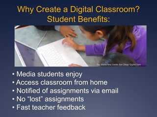 Creating a Digital Classroom Using Google Classroom outlines the benefits of using Google Classroom for teachers and students. It discusses how Google Classroom allows students to access coursework from home, get notified of assignments via email, and avoid losing assignments. Teachers can incorporate Google apps, provide in-app grading, have coursework in one location, and reuse assignments. The document then provides a simple three step process for setting up a Google Classroom: 1) Log into Google, 2) Create a classroom, and 3) Invite students.