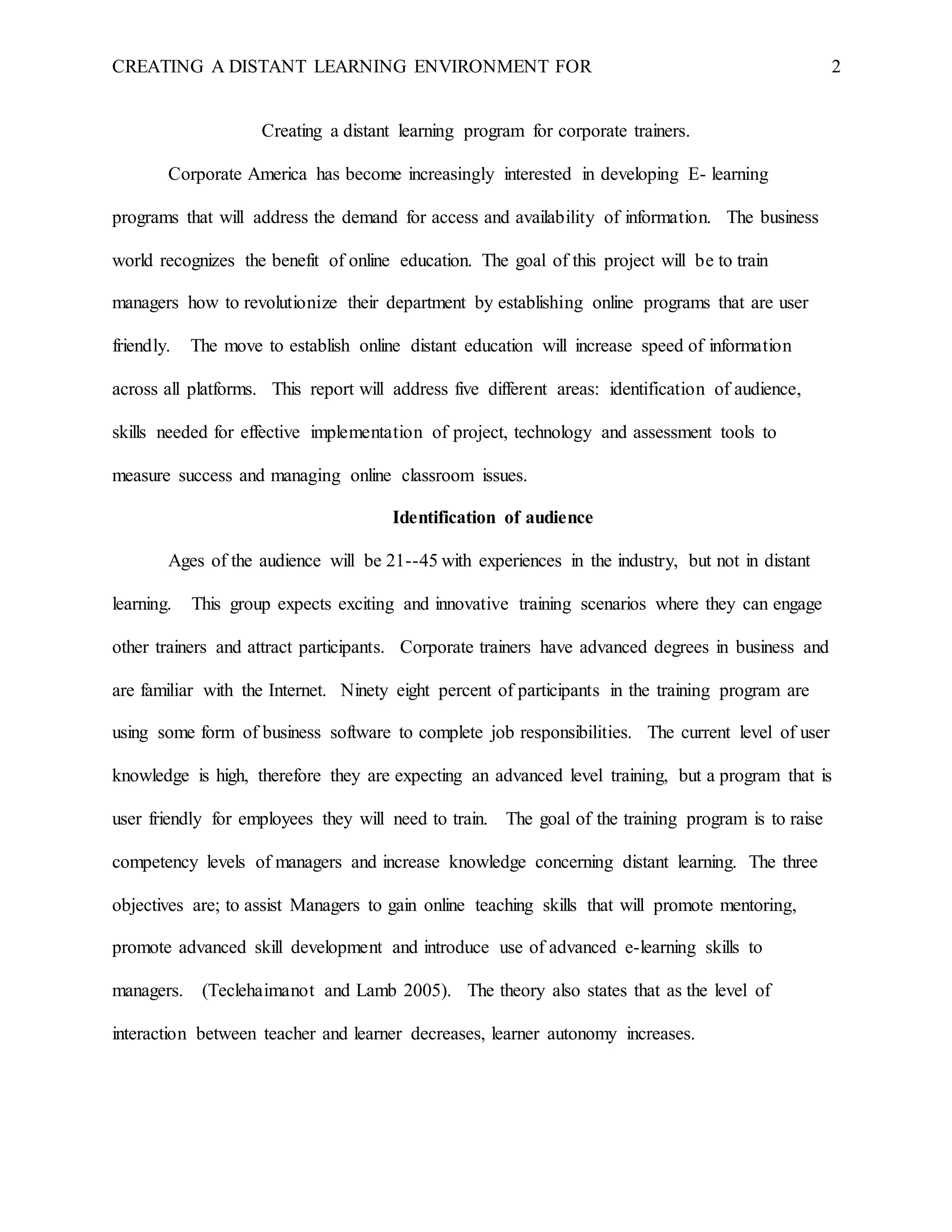 This document outlines a proposal for creating an online training program to teach corporate trainers how to develop distance learning programs. It will train managers over 3 days to gain skills in online teaching using tools like Articulate 360. The training will focus on identifying audiences, skills needed for effective online facilitation like creating engaging content and building trust. It will also cover learning theories like transactional distance theory and connectivism. Trainees will learn to use technology tools like learning management systems, infographics, simulations and will complete a final group project designing an online course using Articulate. The goal is to help managers revolutionize training by establishing user-friendly online programs.