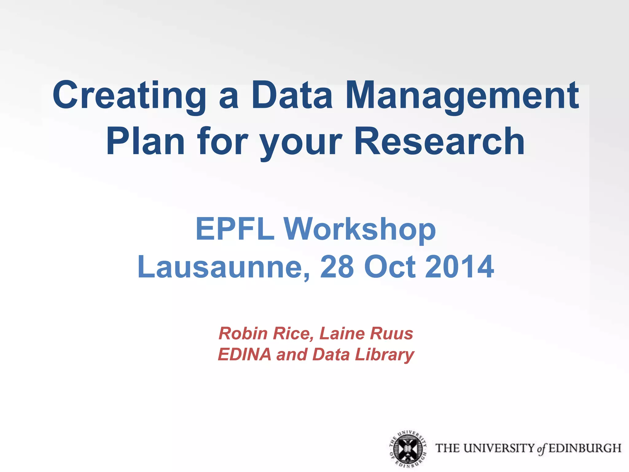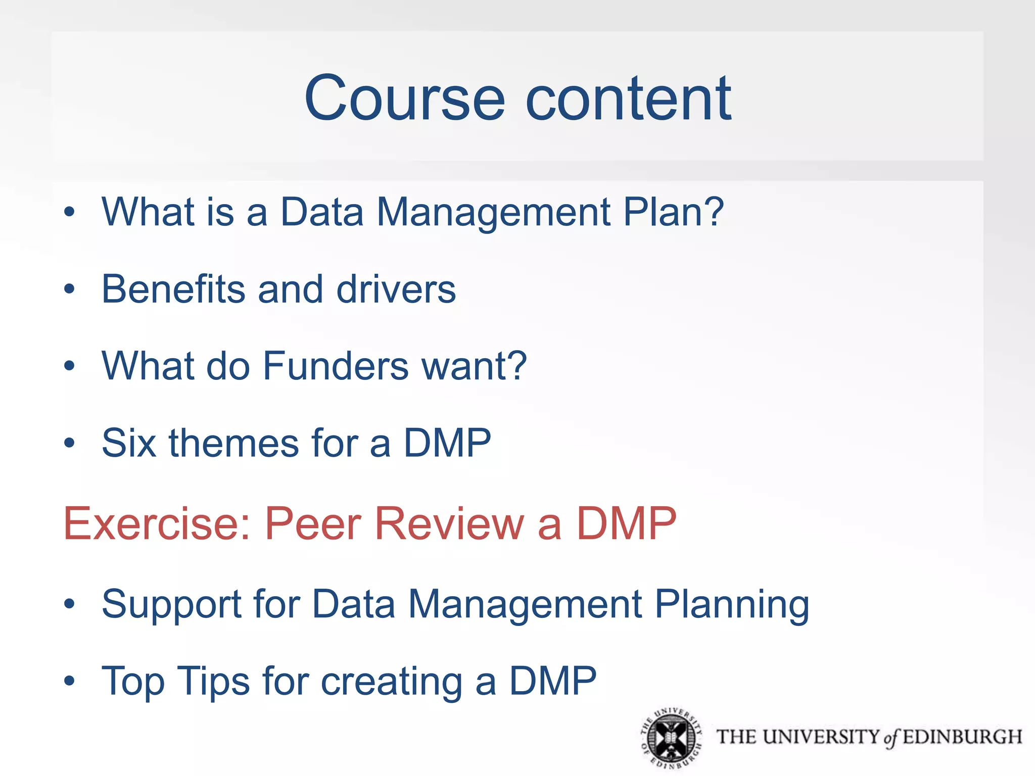 This document provides an overview of creating a data management plan (DMP). It discusses what a DMP is, the benefits of creating one, and what funders require. A DMP defines what data will be collected, documented, stored, shared, and preserved. Developing a DMP helps avoid problems and ensures data are reliable and secure. The document outlines six key themes a DMP should address: data types and standards, ethics, access and sharing, storage, preservation, and resources. Support is available to help researchers develop effective DMPs.