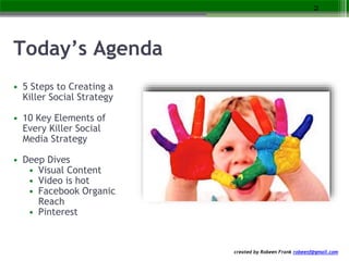 This document summarizes a presentation about creating an effective social media strategy. It discusses 5 steps to building a killer social strategy: 1) knowing your audience, 2) understanding trends, 3) focusing on customers, 4) understanding the buying cycle, and 5) performing a social media audit. It also outlines 10 key elements of an effective strategy, including having goals aligned with business objectives, a content strategy, measuring ROI, and optimizing for mobile. Specific tactics discussed include tailoring messages to buyer personas, creating visual and video content, and leveraging platforms like Facebook, Pinterest, and Instagram.