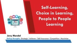 The document discusses driving self-learning and organizational performance through employee engagement. It argues that performance is a function of people and processes, and that enabling, engaging, and empowering employees to drive their own self-learning is key to developing people. Some ways discussed to promote self-learning include offering learning resources, providing varied learning opportunities aligned with goals, building excitement through recognition programs, creating peer accountability, and strategically recognizing success. The perspective is that self-directed learning allows employees to define their own success journey and improves organizational performance.