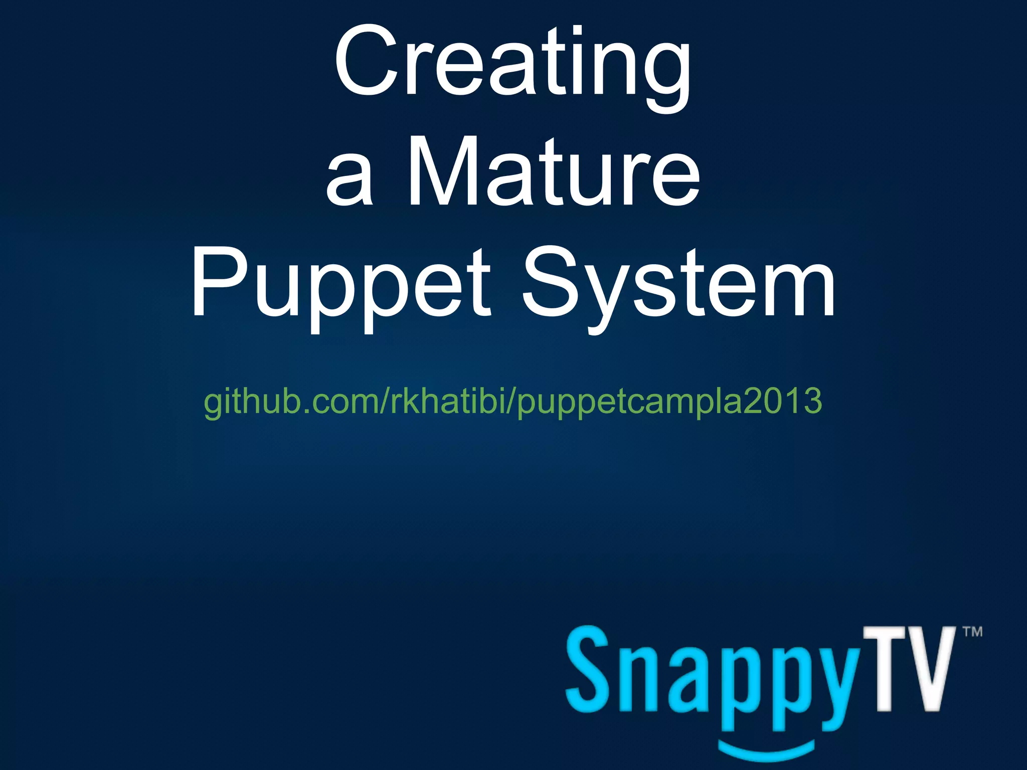 This document provides an overview of steps to create a mature Puppet system, including setting up editors, code validation, environments, master and client configuration, and data management with Hiera. Key recommendations include using Vagrant for testing, validating code with puppet-lint, implementing environments for code promotion, separating code and data, and writing less code by leveraging defaults and Hiera lookups.