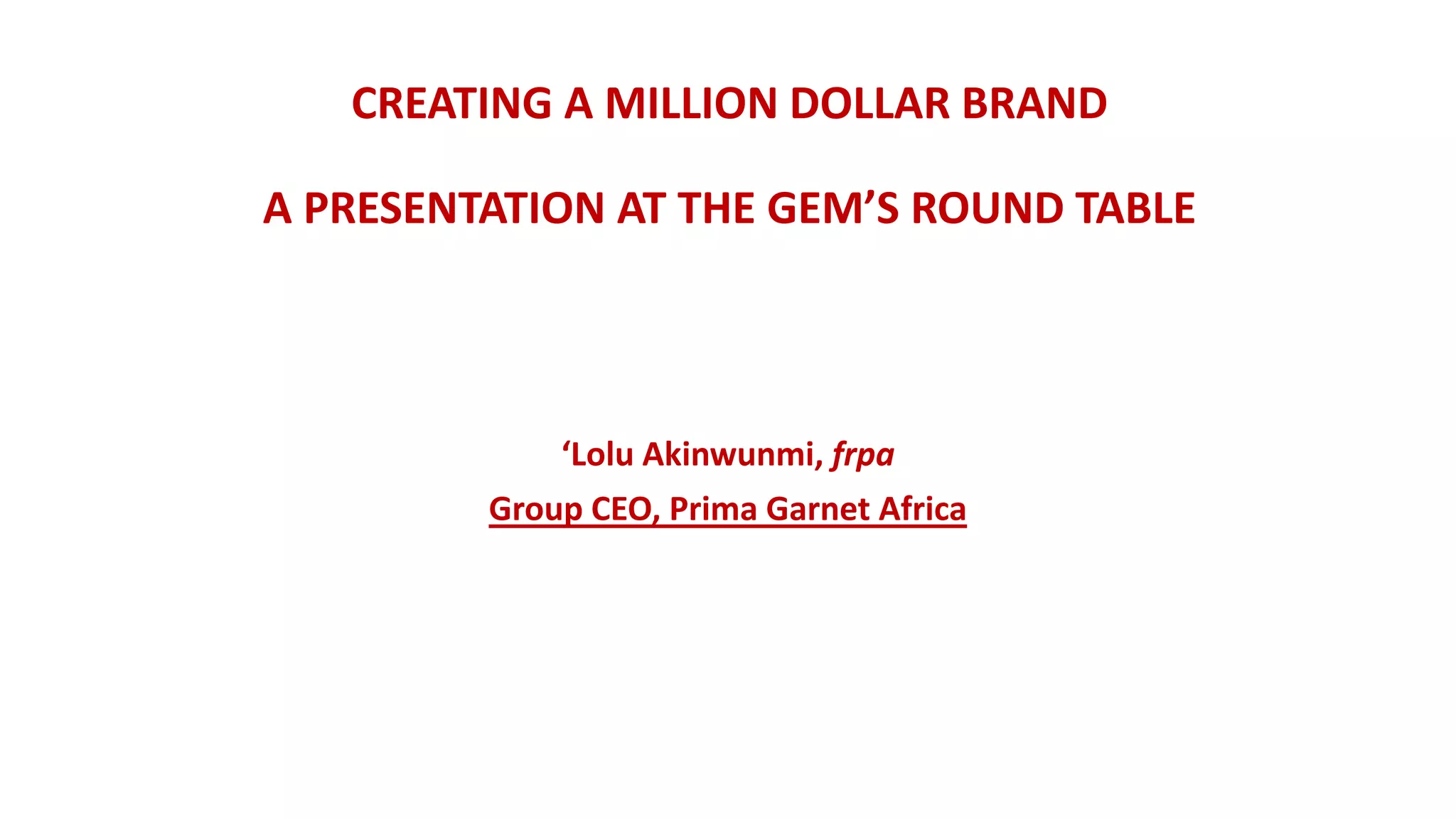 This document discusses how to build a million dollar brand. It begins by defining what a brand is, noting that a brand is defined by a customer's overall perception of a business. It emphasizes that branding is about more than just logos or advertisements - it involves building consistency across all customer touchpoints. The document then provides tips for how to build a brand, such as determining the target audience, establishing a brand mission statement, researching competition to find ways to differentiate, outlining key qualities and benefits, and creating a memorable logo and brand expressions. The overall message is that building a strong brand takes an ongoing process of crafting the right image and experience for customers.
