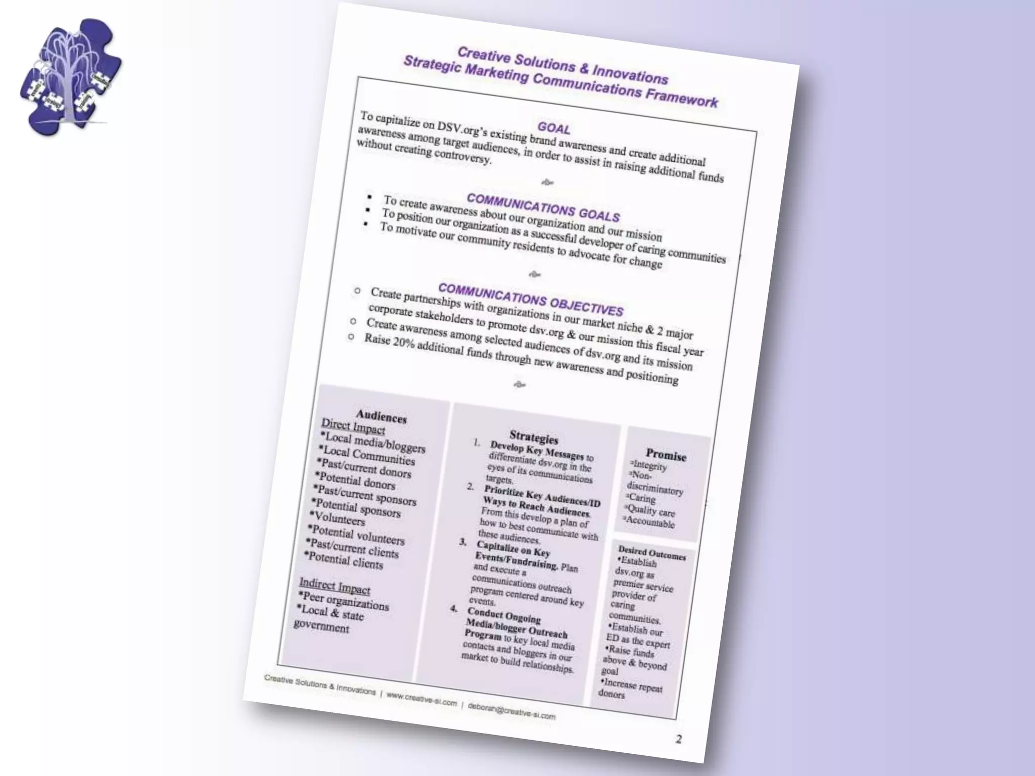 The document outlines the steps to create a strategic marketing communications plan for non-profits, emphasizing the importance of understanding the audience and integrating marketing efforts to support organizational goals. It details characteristics of a good plan, such as being participative and measurable, and provides tools for audience research and key message development. The document also highlights the need for effective communication to enhance fundraising efforts and achieve mission impact.