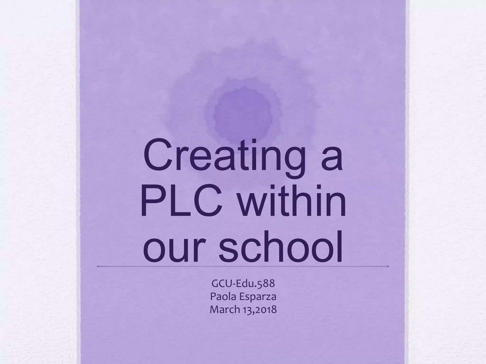 The document discusses creating a professional learning community (PLC) at a school. It begins with introductions of the presenter and their background. The objective is to learn what a PLC is and the benefits of creating one at the school. A needs assessment found a desire for more collaboration time among colleagues. A PLC is defined as grade levels meeting to plan instruction and share strategies. Guidelines are provided for organizing PLC meetings including assigning roles like grade leader. Examples of effective and ineffective PLC meetings are shown. Benefits include increased collaboration and data-driven instruction. Next steps proposed are forming PLC groups and assigning roles at each grade level.