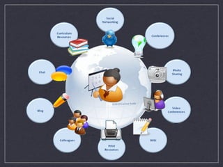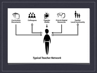 This document provides information about personal learning networks (PLNs) and how to begin creating one. It discusses that PLNs allow individuals to learn, ask questions, and seek help, advice, ideas and resources from others. It then provides various online resources and accounts to follow as initial starting points for finding people to connect with and content to explore when first developing a PLN.