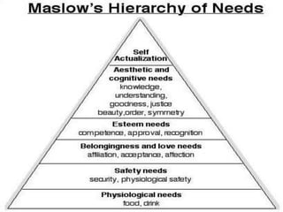 This document outlines how to create a positive work environment. It defines a positive work environment and lists 10 strategic and operational elements that contribute to one, such as vision/values, leadership, communication, and performance management. It also discusses motivation theories like Maslow's hierarchy of needs, Herzberg's two-factor theory, and Alderfer's ERG theory. The document provides several ways to build and sustain a positive environment, such as building trust, communicating openly, recognizing staff, and making the physical workspace pleasant. It concludes by comparing signs of positive versus negative work environments.