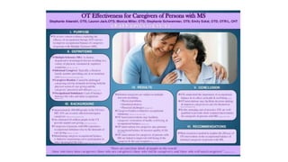 The document provides instructions for creating a research poster, including reviewing sample posters and an article on best practices. It discusses font size, logo placement, poster size, image and graphic quality, and elements that make a poster engaging. A sample student research poster is also included, with sections on the problem, methodology, results, conclusions, and references. The poster summarizes a study on the occupations of school-aged children who have siblings with cognitive or behavioral disabilities.