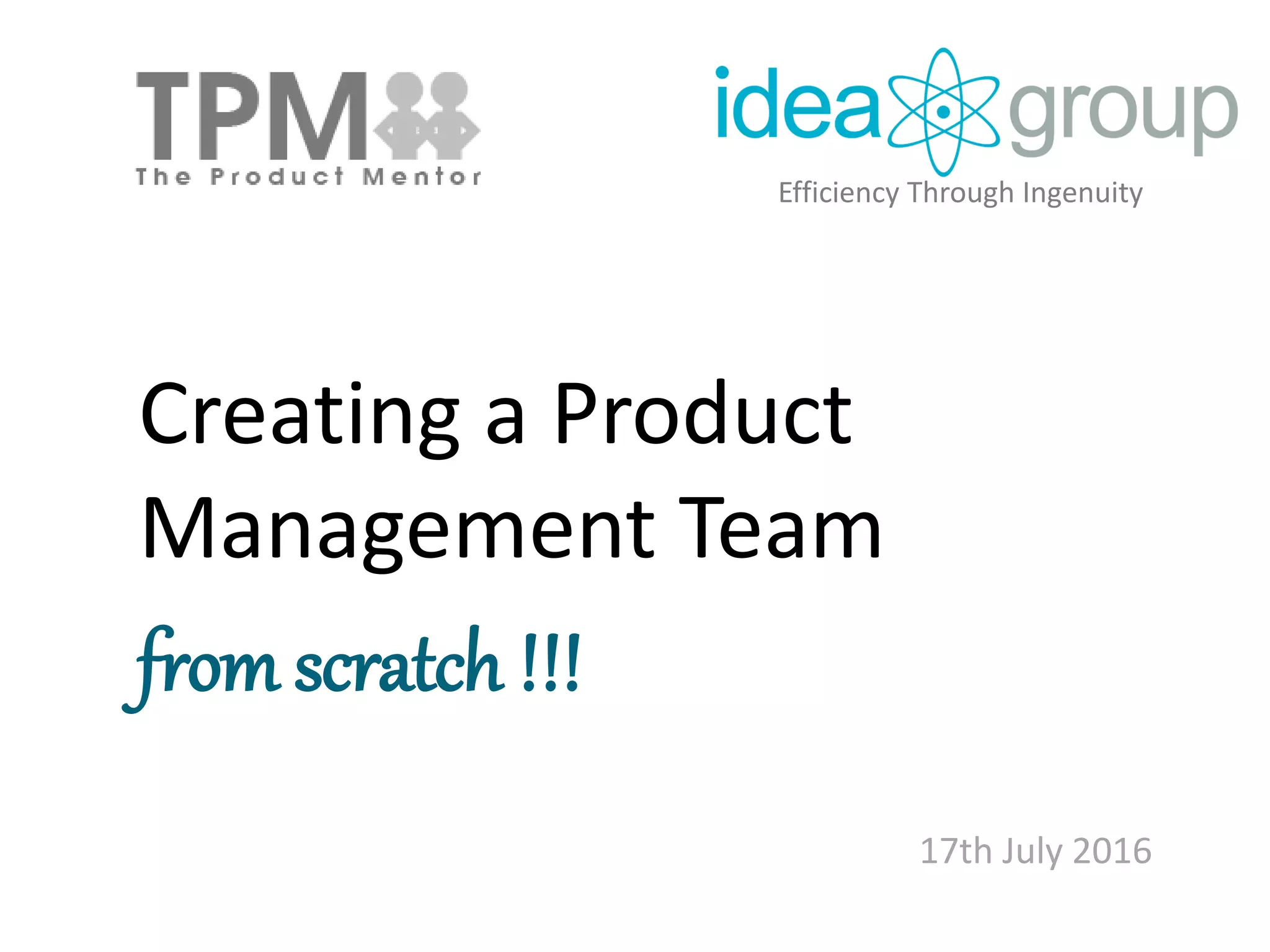The document outlines the process of establishing a product management team from scratch, emphasizing the importance of product management in businesses. It covers key steps such as defining products, structuring the team, developing processes, and training staff to ensure effective product management. Additionally, it highlights the need for clarity in roles, communication, and maintaining standards to foster a strong product management culture.