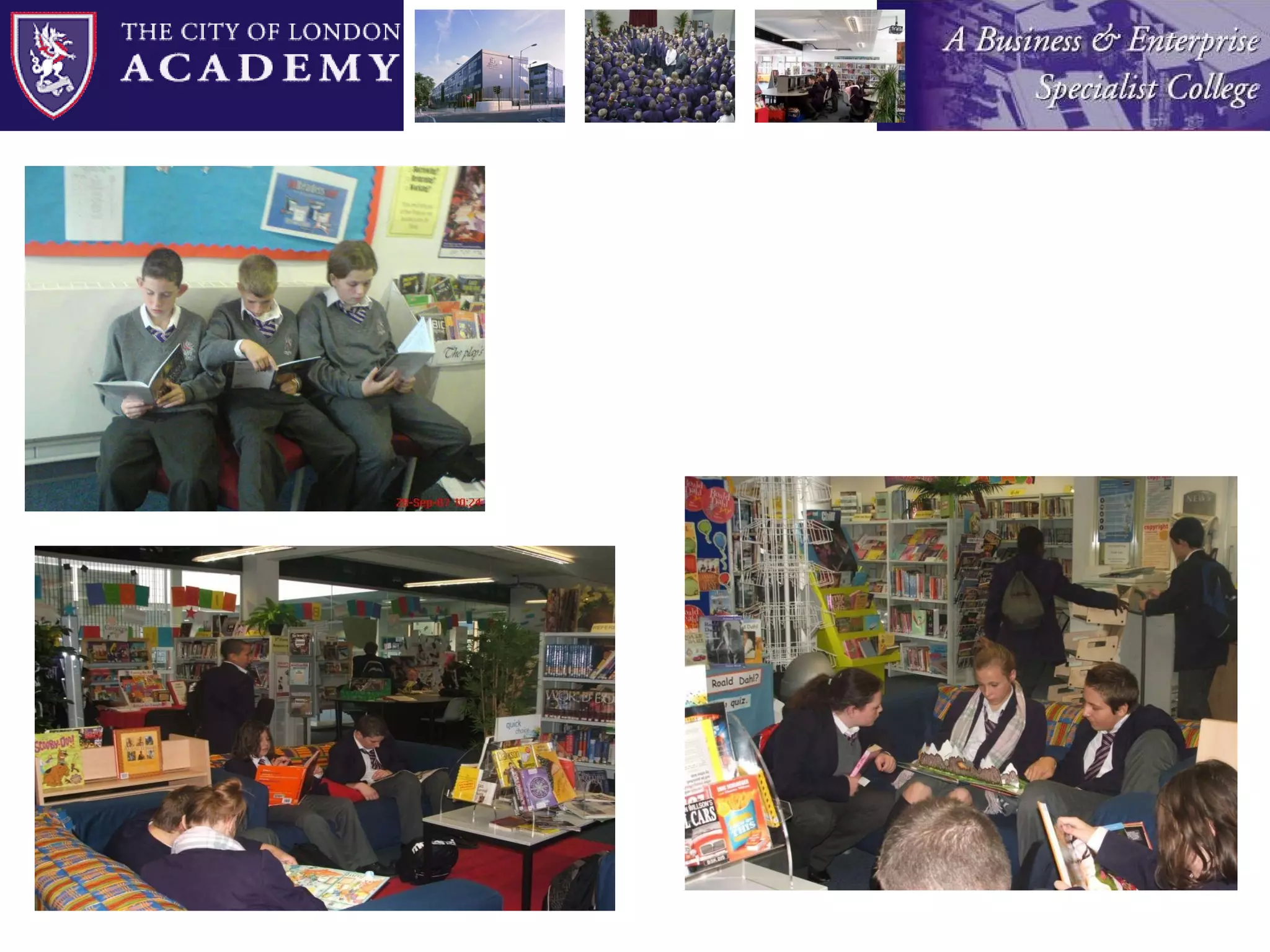 The document discusses initiatives at the City of London Academy to promote a reading culture. It outlines the student demographics and attainment levels. It then describes the library programs and resources available, including the literacy program, reading buddies program with local primary schools, and clubs to encourage reading. Accelerated Reader and other national reading initiatives are also mentioned.