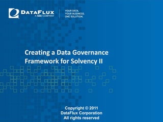 The document describes the DataFlux Solvency II Data Governance Framework, which provides both the technology and methodology for insurers to achieve Solvency II data governance requirements. The framework uses a 6-step approach to measure data accuracy, appropriateness, and completeness. It includes the DataFlux software, documentation templates, and services to design and implement ongoing data quality checks, reporting, and improvement processes. The goal is to help insurers efficiently meet Solvency II regulations for data governance and regulatory reporting.