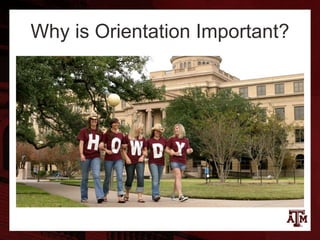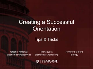The document provides tips and options for creating a successful student orientation program. It discusses the importance of orientation and identifying student and program needs. Three orientation options are described: a two-day information heavy orientation; informational sessions plus social activities; and a two-week orientation including lab training and weekly information sessions. The goal is to help incoming students transition successfully by providing important information and opportunities to connect with current students and faculty.