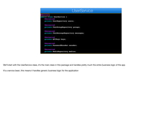 The document details the implementation of a userservice class for a WhatsApp clone, which manages business logic such as user login, signup, and activation via SMS using Twilio. Key functionalities include user authentication, verification code generation, and message sending to users or groups through a socket connection. It also describes the management of user properties and interaction with repositories for maintaining user data.