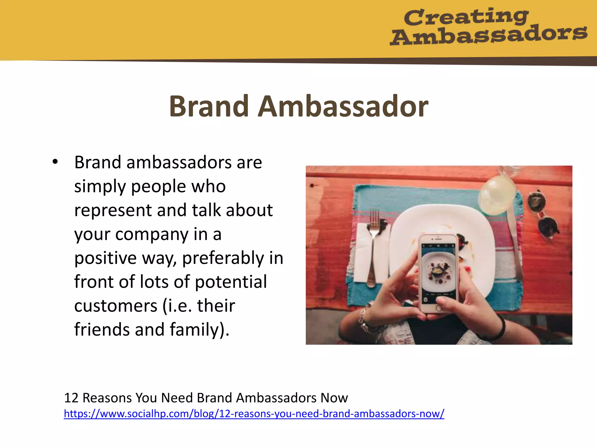 This document provides information on brand ambassadors and how they can help promote businesses. It defines different related roles like influencers, brand advocates, and micro-influencers. It then lists 12 reasons why businesses need brand ambassadors, such as helping to humanize products, raise loyalty, and provide positive word-of-mouth. Additional details are given on how to build an effective brand ambassador program, including setting goals, recruiting the right ambassadors, offering them incentives, and keeping them engaged over time. Case studies show how employee brand ambassadors at companies like Adobe have significantly helped to build customer goodwill and influence sales.