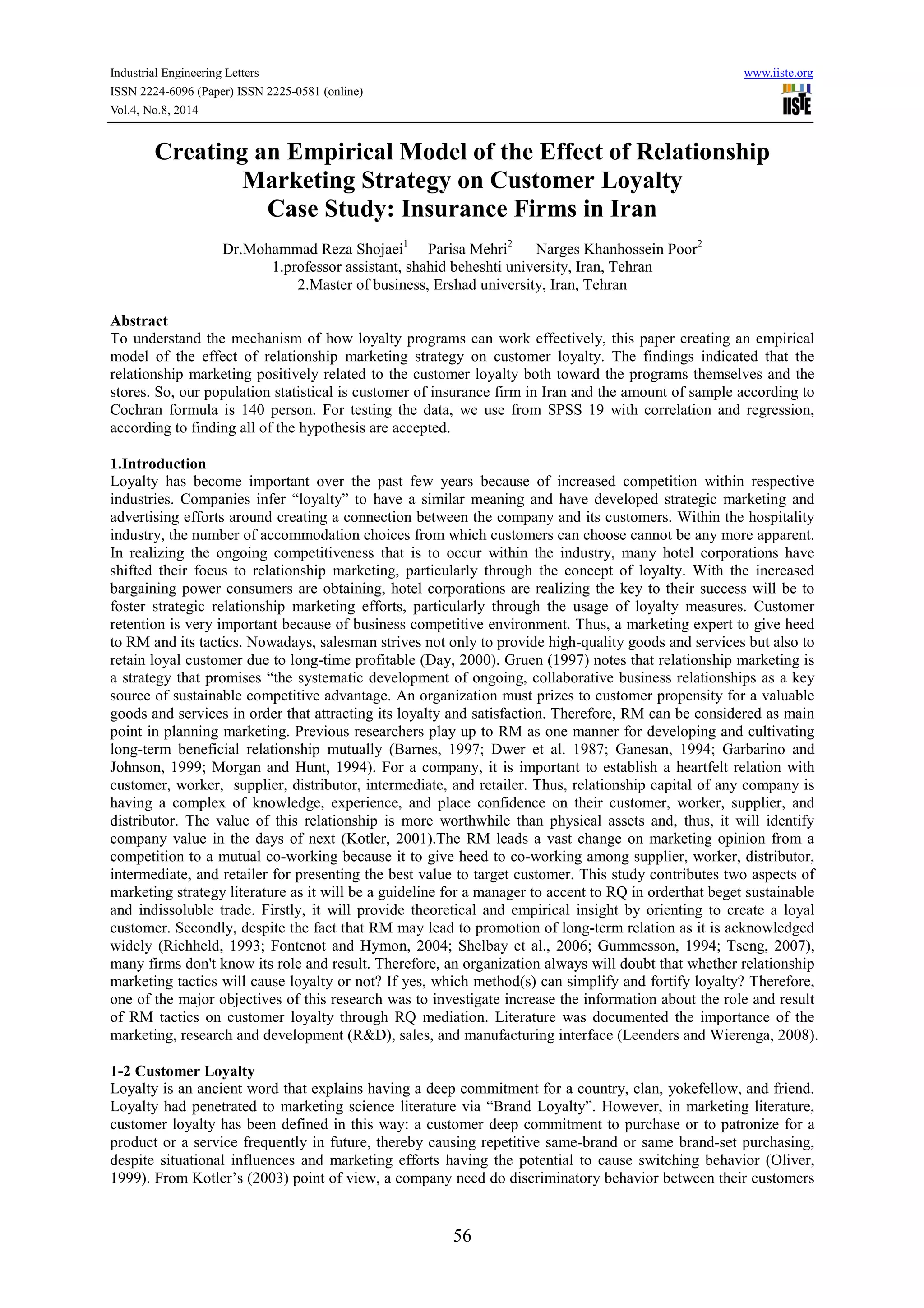 This study investigates the impact of relationship marketing strategies on customer loyalty within insurance firms in Iran. Using a sample of 140 participants, the findings reveal a positive correlation between relationship marketing and customer loyalty, highlighting the importance of trust, communication, and satisfaction in building long-term customer relationships. Ultimately, the research underscores the significance of relationship marketing tactics over traditional loyalty programs in fostering customer retention.