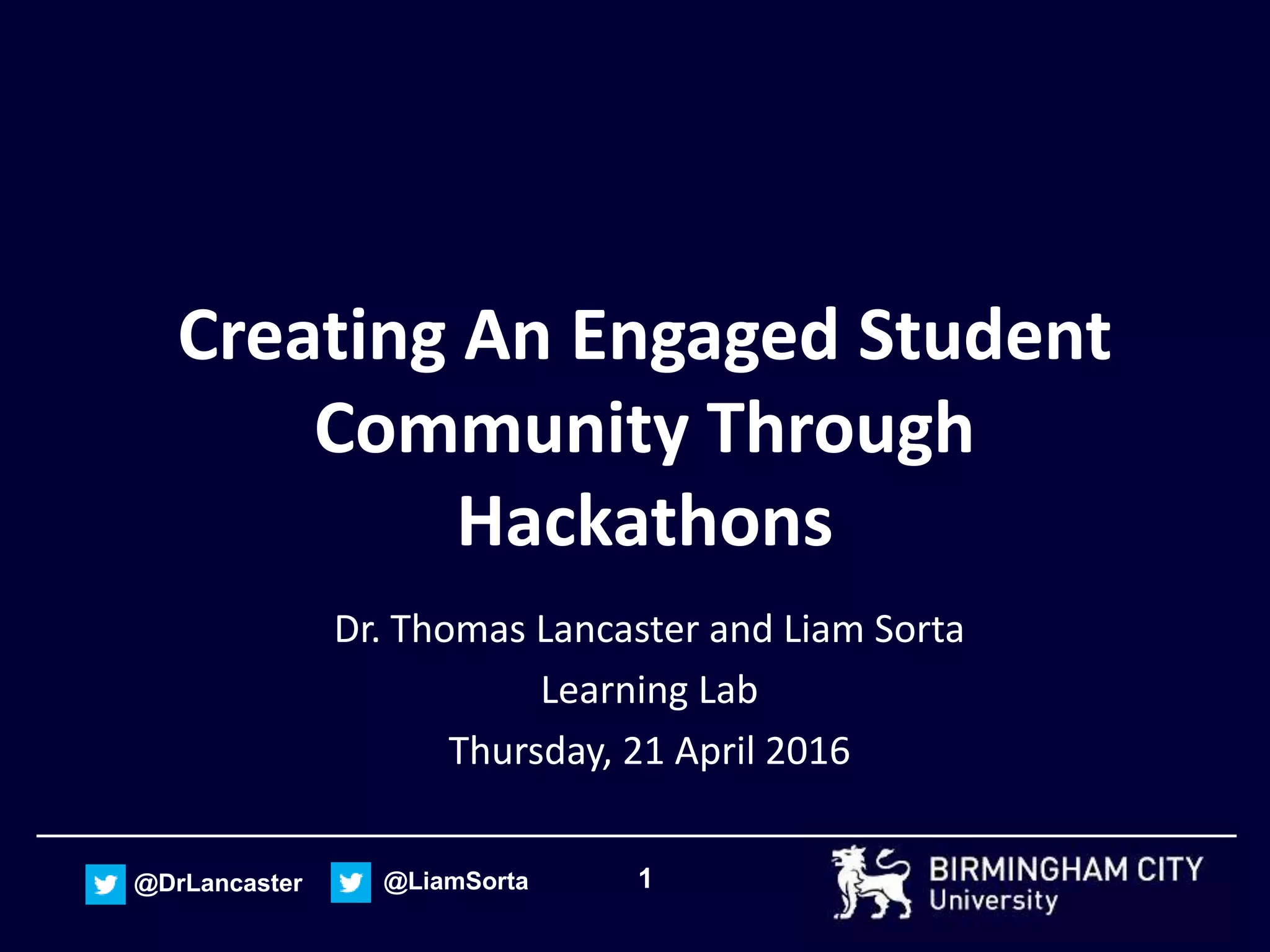 The document discusses how Dr. Thomas Lancaster and Liam Sorta aim to engage students in computing through hackathons to enhance employability and community. It highlights various events including the BCU hack and details the challenges and outcomes of implementing such initiatives. Recommendations for future success include continued university support and collaboration with student committees.