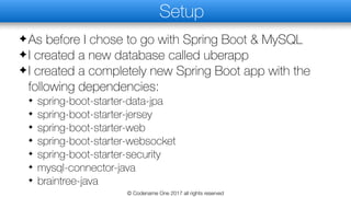 The document describes the setup and implementation of user authentication for a Spring Boot based Uber clone application. It defines a User entity and UserService with methods for registering, authenticating, and updating users. The service implements authentication via phone, Facebook, or Google ID and password validation. Security is configured with BCrypt password encoding and authorization of API requests.
