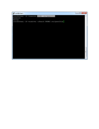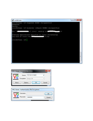 This document discusses how to create, configure, and manage VNC server sessions on a system. It describes how to create a basic VNC session using the vncserver command and connect with a VNC viewer. It also explains how to define session properties like depth and geometry, list existing sessions, change passwords, use different passwords for each session, and control the VNC server service.