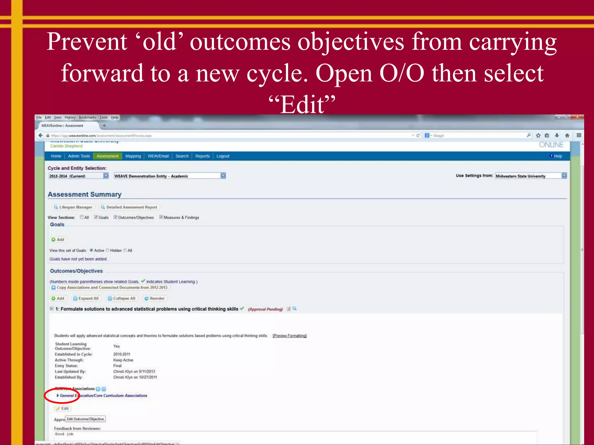 These slides explain how to end outcomes/objectives and measures in Weave from previous cycles without deleting the information. Users are instructed to end measures before outcomes/objectives to avoid errors. The process involves editing the "Active through Cycle" date for outcomes/objectives to the previous cycle and using similar steps for measures. New outcomes/objectives can then be added and associations from previous cycles can be copied over.