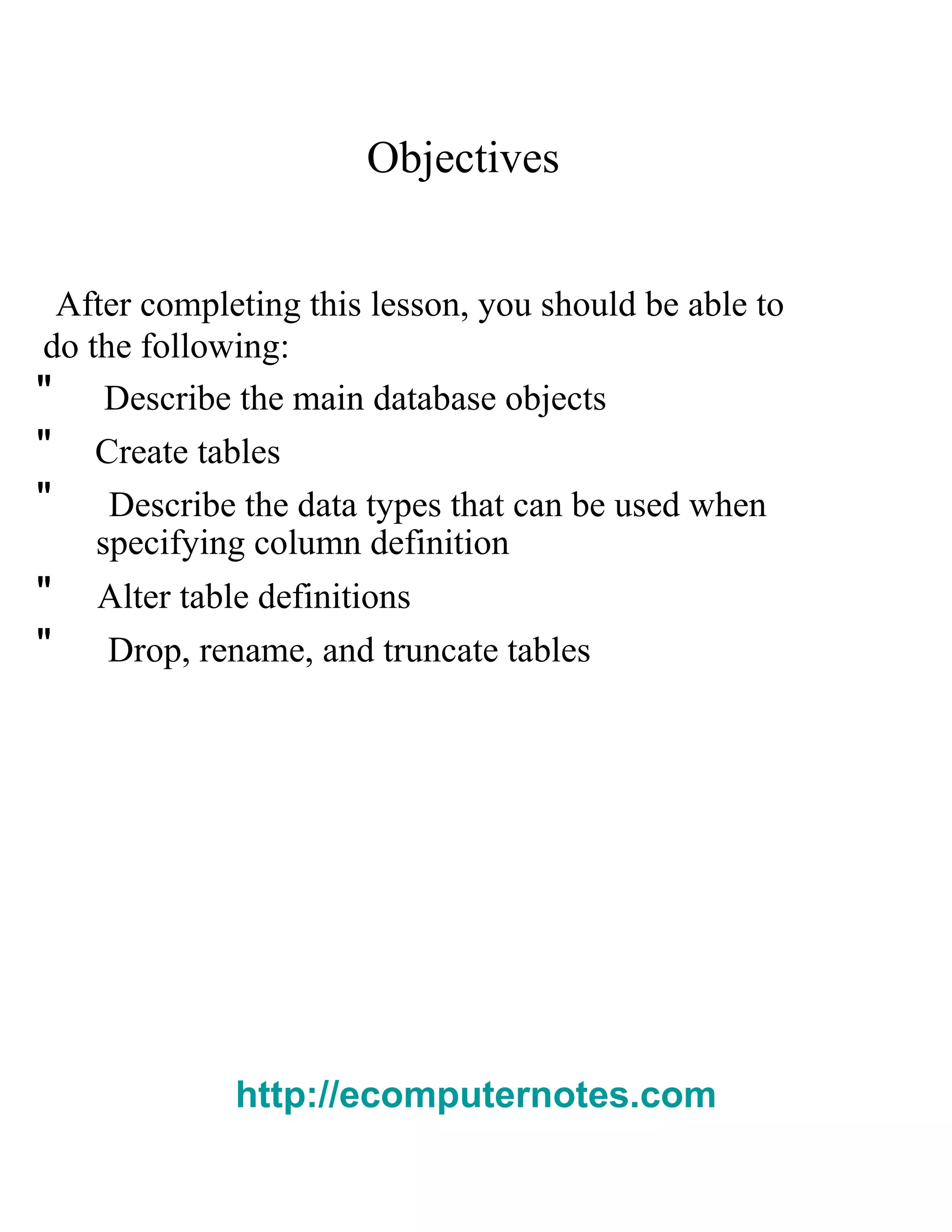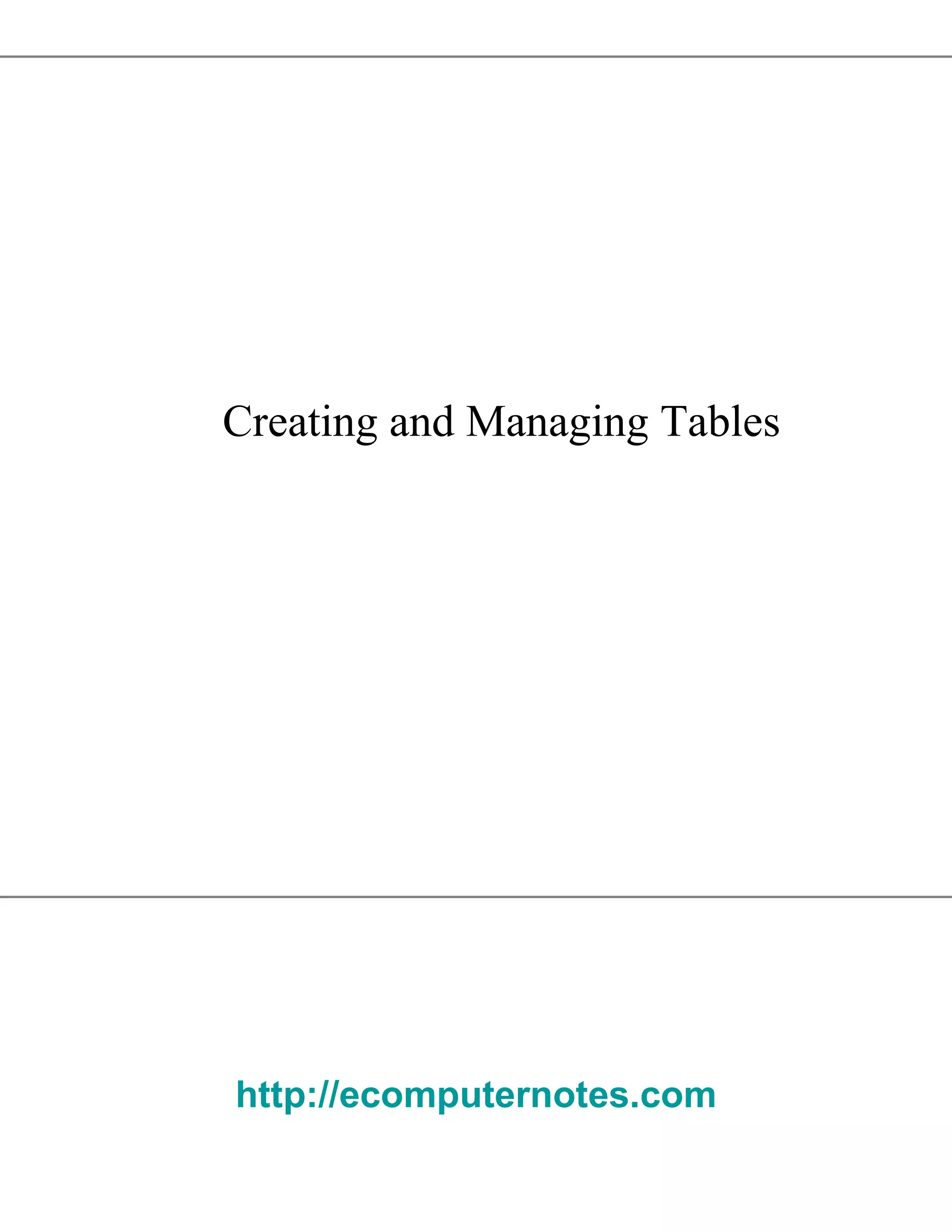 The document discusses how to create and manage database tables in Oracle. It covers how to create tables, add, modify and drop columns, set column defaults, rename and truncate tables, and add comments. It also describes different data types that can be used as table columns such as numbers, dates, strings, and LOBs.