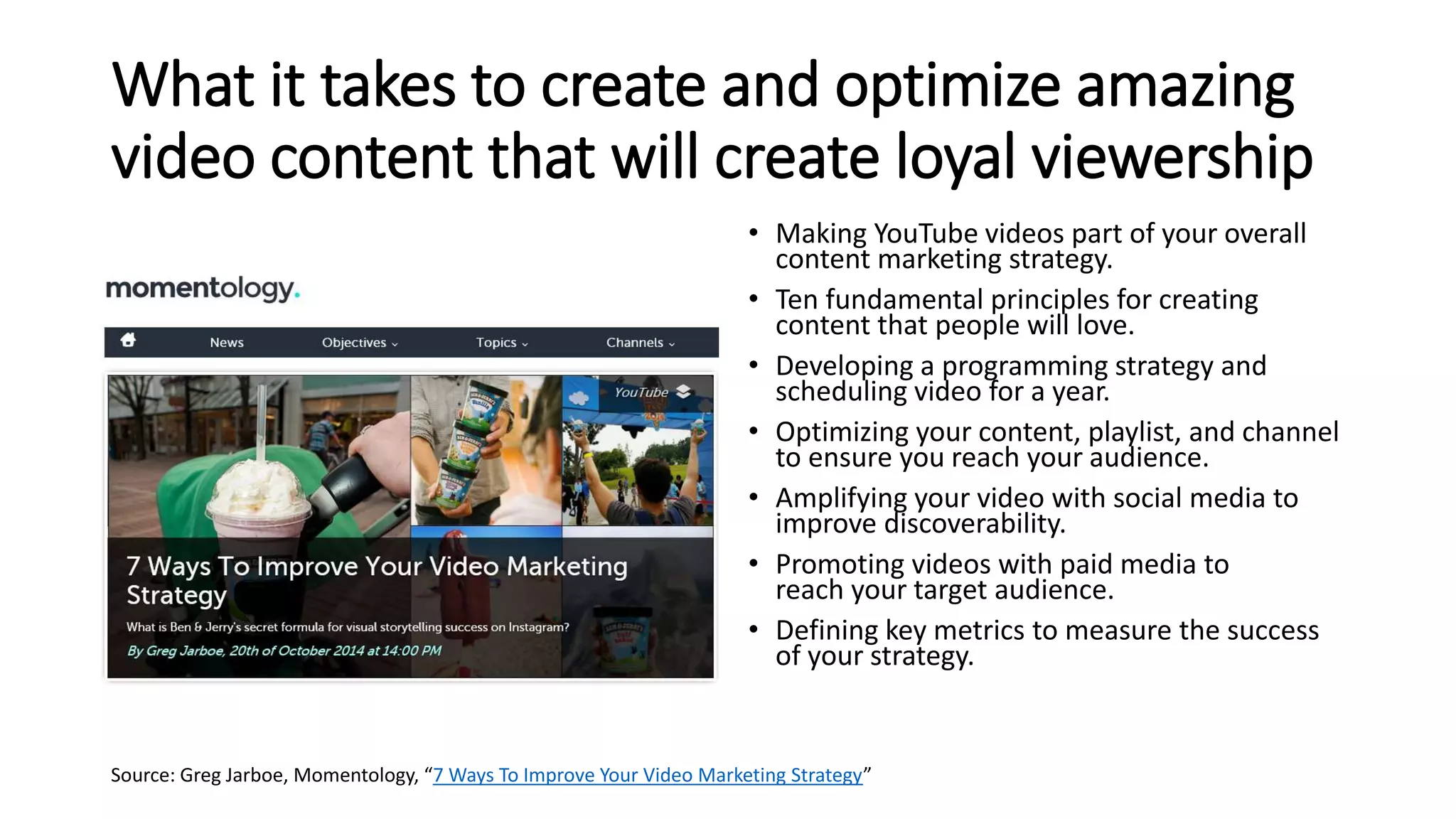 The document discusses strategies for creating and optimizing video content for YouTube, emphasizing the importance of integrating videos into overall content marketing strategies. Key principles include developing a programming strategy, optimizing content for discoverability, and utilizing social media to amplify reach. Additionally, it covers measuring success through various metrics, shifting the focus from mere views to deeper engagement and interaction with audiences.
