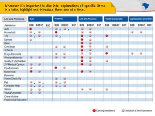 The document discusses different types of assistance that could be offered as part of an assistance program, including assistance for auto, household, trips, demise, basic needs, schools, discounts on drugs, women's/maternity needs, quality of life/nutrition, second medical opinions, condominiums, motorcycles, businesses, home checkups, pets, computer help, seniors, young people/university students, and crime victims. It shows the existing types of assistance and proposes including new types of assistance. Many insurers already bundle home coverage into their auto insurance plans.