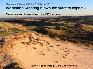 The document discusses creating and managing blowouts in dune systems to restore habitat diversity. It provides examples from the PWN dunes of the Netherlands. Statistics show most natural blowouts form within 1000 meters of the beach and are 10-100 square meters in size. Both small and large blowouts can be reactivated. The size and goals of projects influence blowout size. Care must be taken when rejuvenating old blowouts that provide refuge. Erosion ridges are important habitat features that can be artificially created to manage blowouts. Overall the document explores considerations for intentionally creating blowouts through management and restoration efforts.