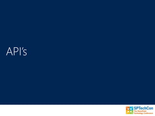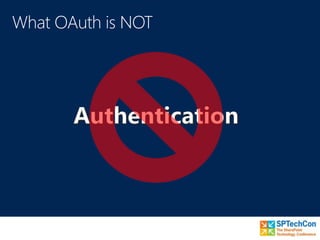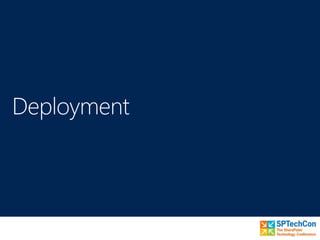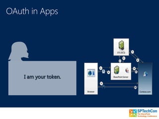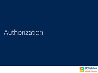 This document discusses authorization methods in SharePoint including OAuth and access tokens. It also summarizes differences between .NET and JavaScript for developing SharePoint solutions. REST APIs are covered as well as options for deploying SharePoint apps such as the App Catalog, Office Store, and private packages. Trust models like high trust using certificates and low trust with Azure ACS are also summarized.