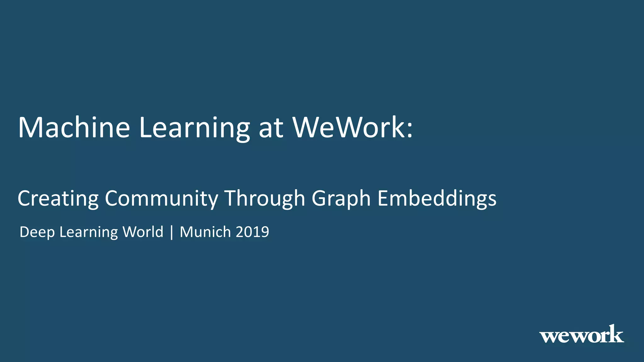 This document discusses how WeWork is using graph embeddings and the node2vec algorithm to power member recommendations. It first describes WeWork's member knowledge graph that contains data on members' profiles, interactions, interests and skills. It then explains how node2vec can learn vector representations of each member node that capture similarities, which can be used for recommendations. WeWork runs node2vec on the social graph of each location to map members to vectors and identify the most similar members to power recommendations like onboarding suggestions and introductions between members.