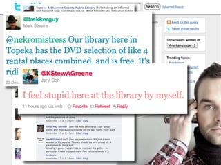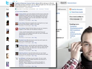 This document discusses creating a positive community experience at the library by focusing on free resources, staff, listening to customers, gathering feedback through focus groups, analyzing statistics, improving ordinary interactions, making the library destination, ensuring interaction is key, focusing on resources and staff, and continually planning what's next. The overall message is that libraries should work to improve the customer experience through various low or no-cost methods of engagement, outreach and assessment.