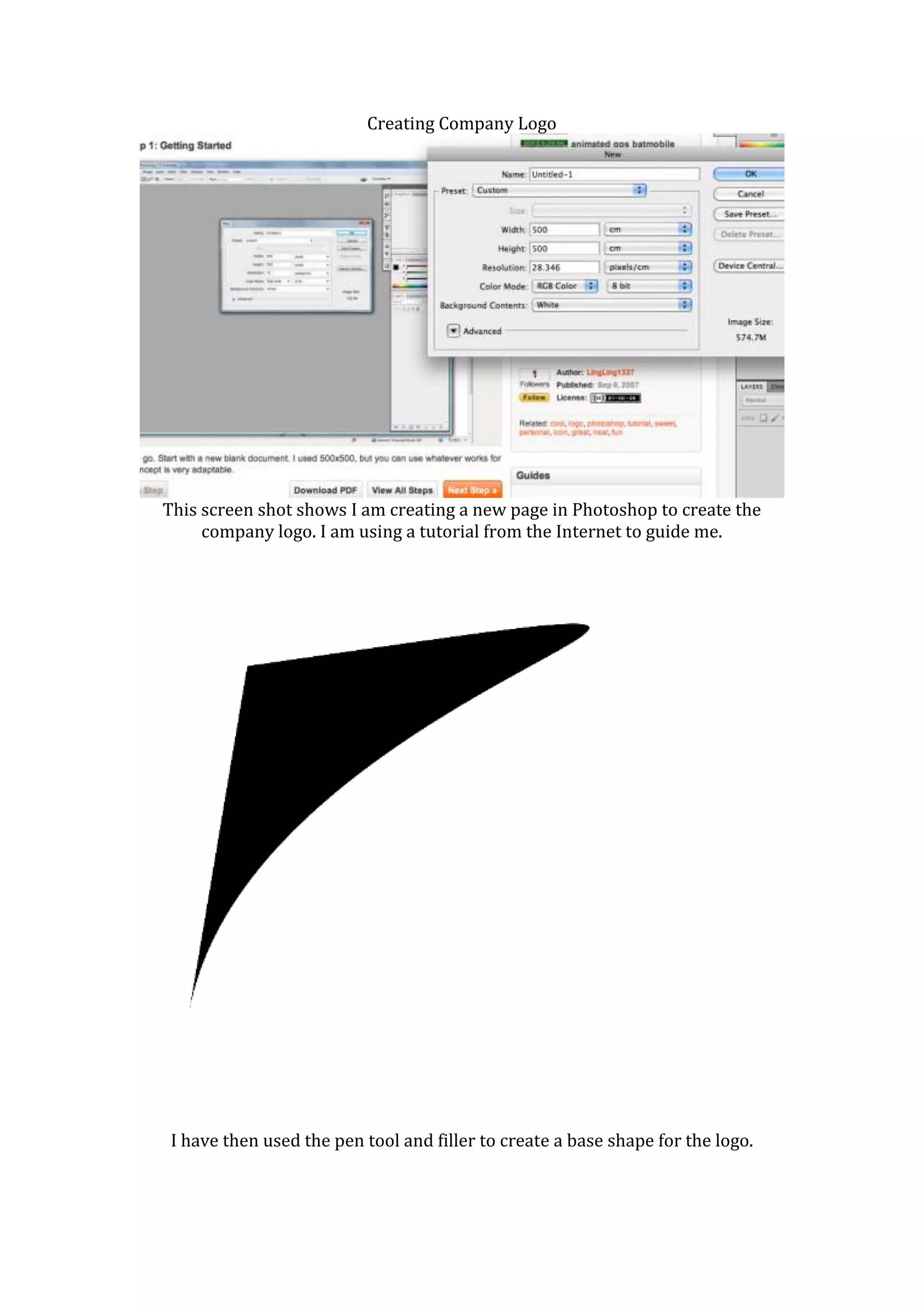 I have opened Photoshop to create a new company logo using an online tutorial. I used the pen tool to create a base shape which I duplicated on another layer. I resized the second shape and arranged it on top of the larger shape before adding text. Finally, I added a lens flare to represent the "lunar" theme of the production company.