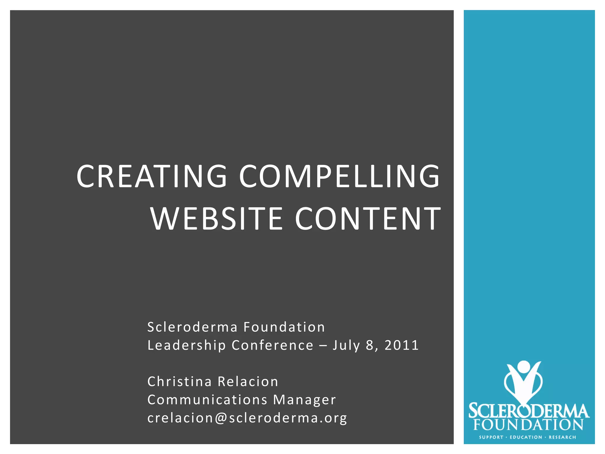 The document provides tips for creating compelling website content. It discusses defining your message and keeping it simple, writing catchy yet visually engaging copy, showing images or videos instead of just words, not reinventing the wheel by looking to other sites for inspiration, and carefully checking your work for errors. The document encourages taking immediate action such as posting newsletters, linking to social media, adding short videos or photos from events, and highlighting patient stories. The overall message is to set goals for your website, understand your audience, craft your message carefully, and use various media and resources to engage visitors.