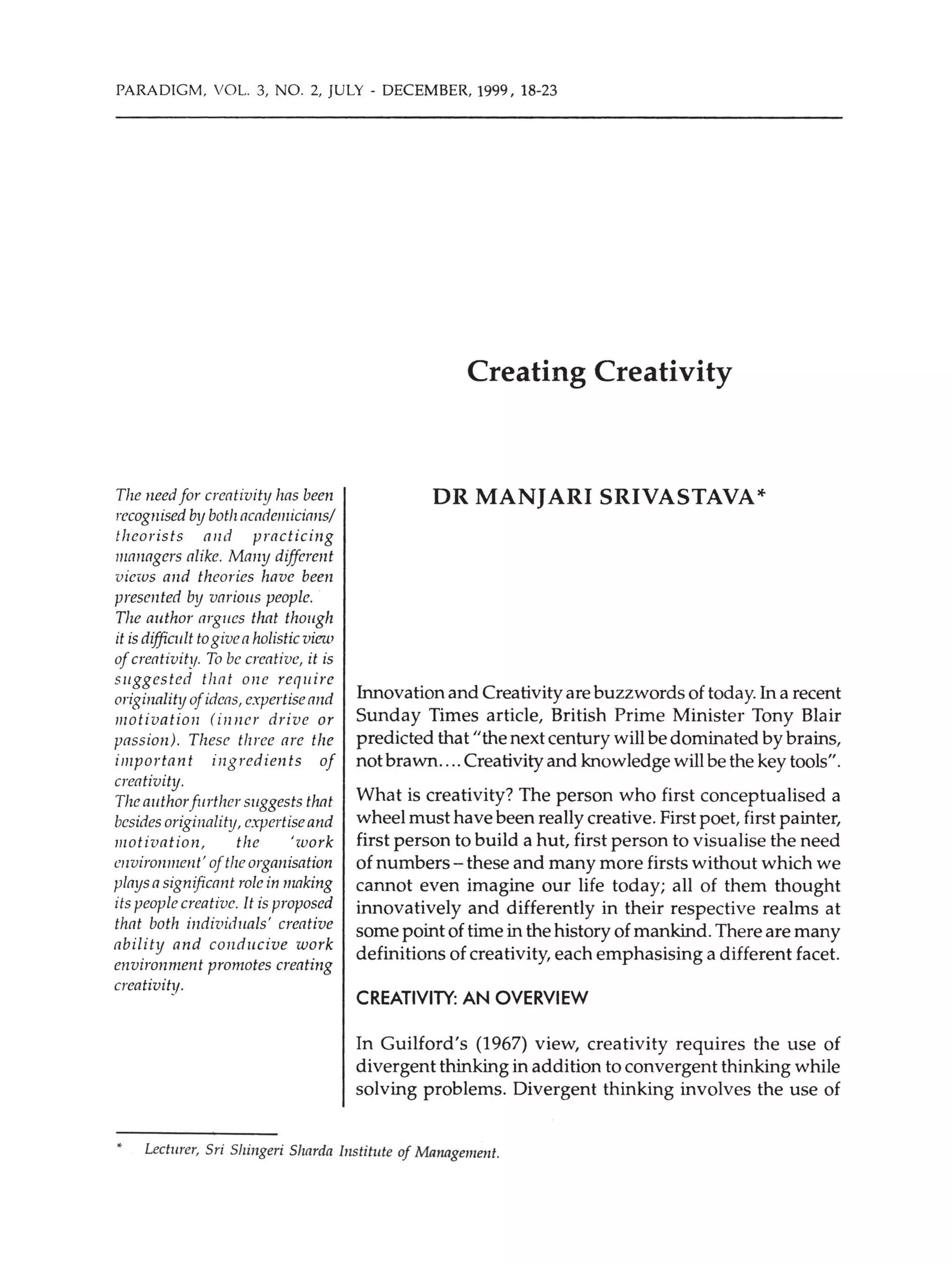 This document discusses creativity in the context of business organizations. It argues that to be creative, one needs originality of ideas, expertise, and motivation. The work environment also plays a significant role in fostering creativity. Specifically, the document outlines that a conducive work environment provides challenges that match employees' skills, freedom in goal-setting and work processes, and sufficient resources like time, money, and space to support creativity. Both individual creative abilities and a supportive work environment are needed to promote creativity in organizations.