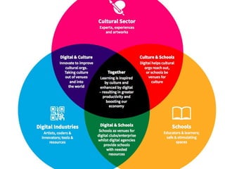 The document discusses the integration of digital technology into creative and cultural learning, highlighting trends, challenges, and potential new tools to enhance this process. It emphasizes the importance of creativity for well-being, the pressures facing educational institutions, and the convergence of digital and cultural sectors. Various case studies and technologies are presented to inspire participants to leverage digital tools for transformative learning experiences.