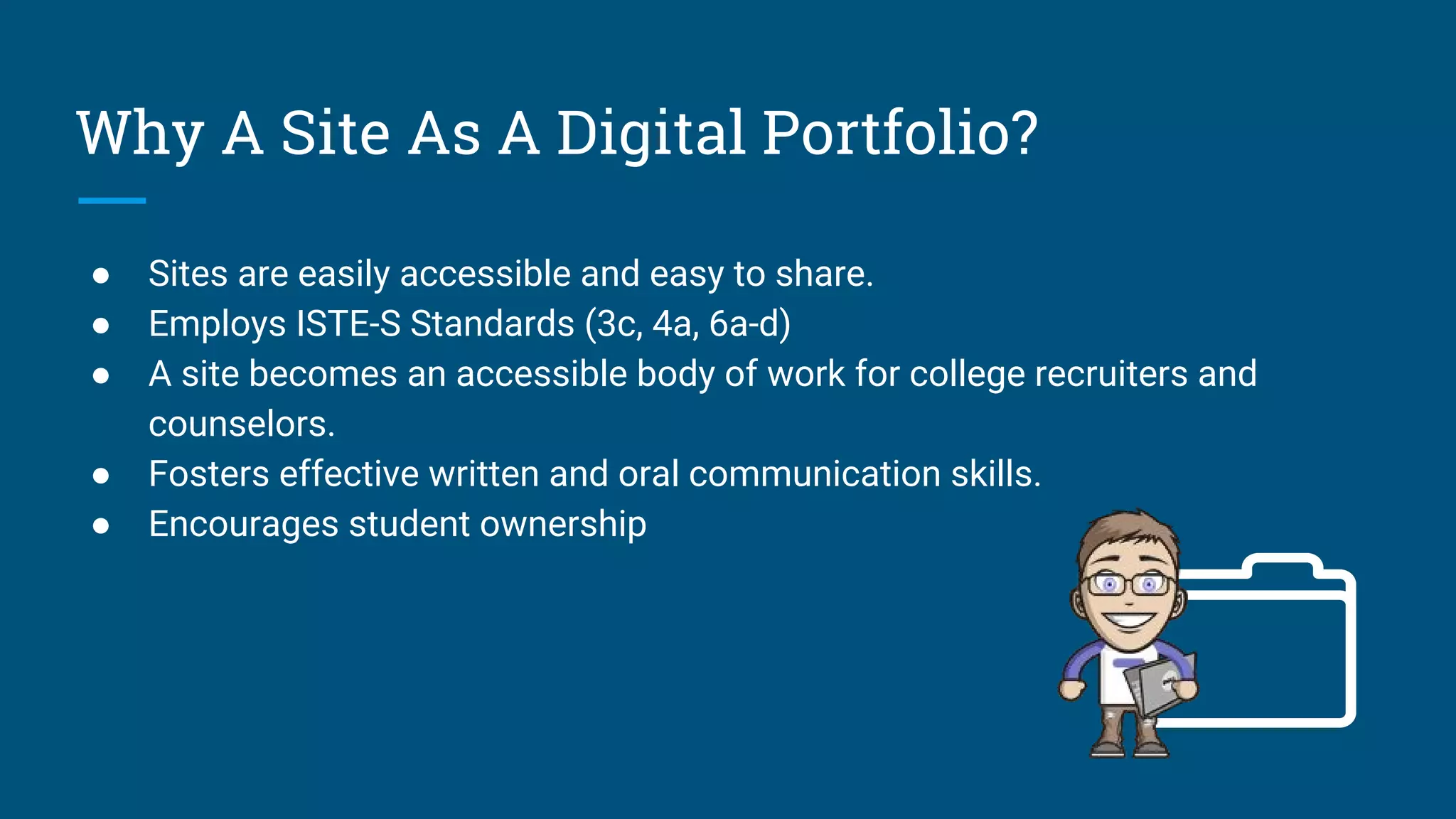 The document provides guidelines for creating digital portfolios using Google Sites, highlighting its accessibility, effectiveness in communication, and potential benefits for students. Key elements to include are an 'About Me' section, goals, links, skills, artifacts, and education, along with instructions for embedding content and linking to social media. Additionally, it emphasizes digital citizenship and responsible online practices.
