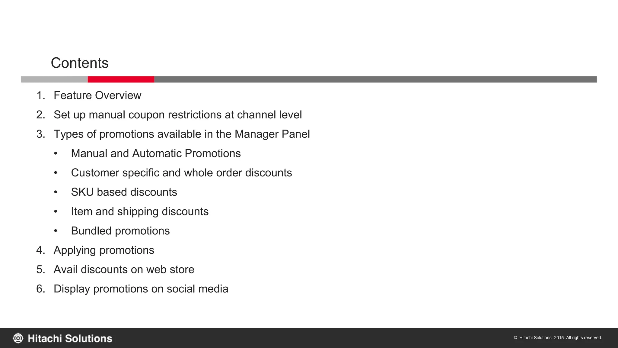 The document outlines the features and functionalities of Hitachi Solutions’ eCommerce platform for creating discounts and promotions. It describes various types of promotions available, such as manual and automatic discounts, item and shipping discounts, and bundled promotions that can entice shoppers and increase sales. Additionally, it includes guidance on setting up coupon restrictions, customer-specific discounts, and sharing promotions on social media.