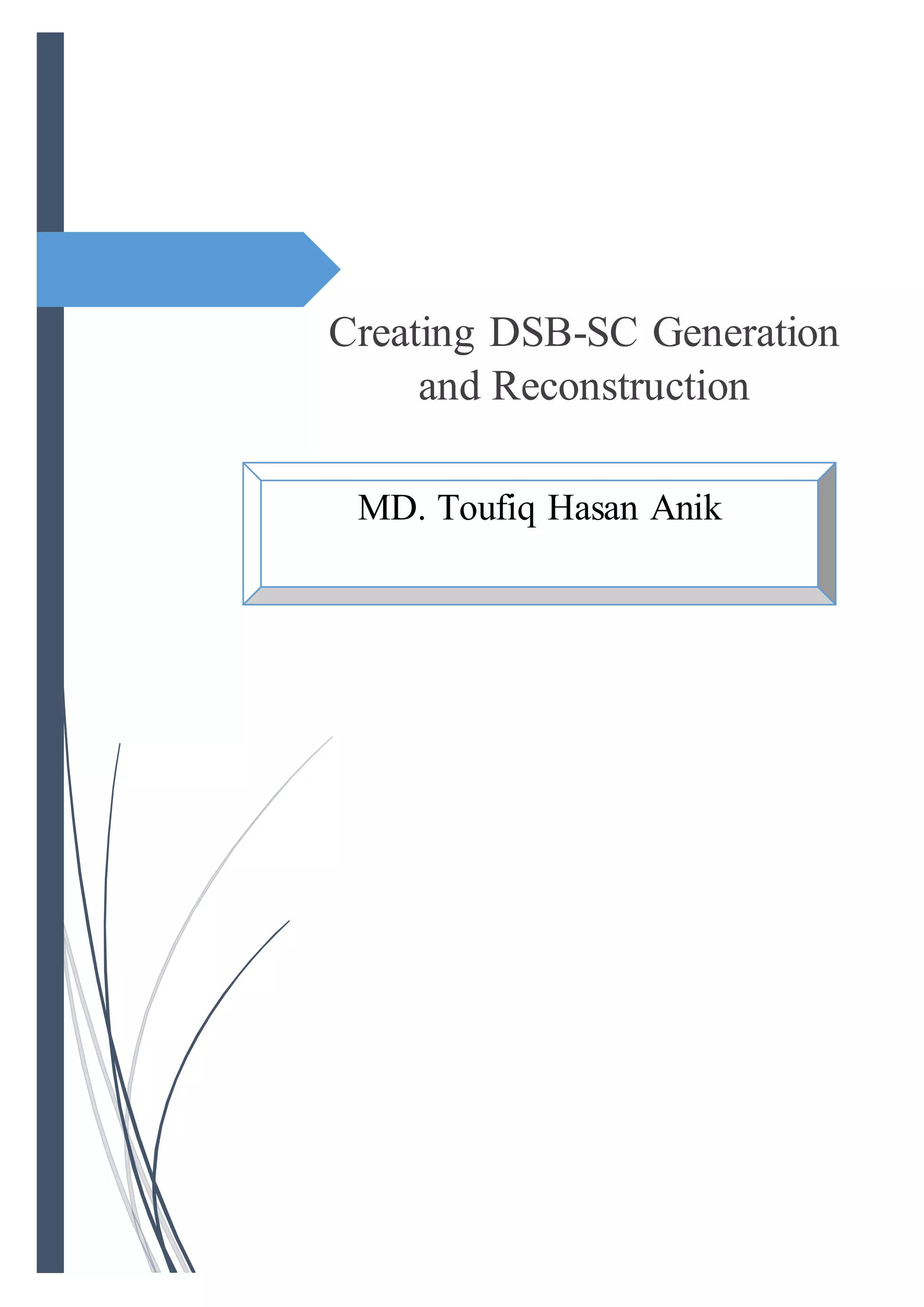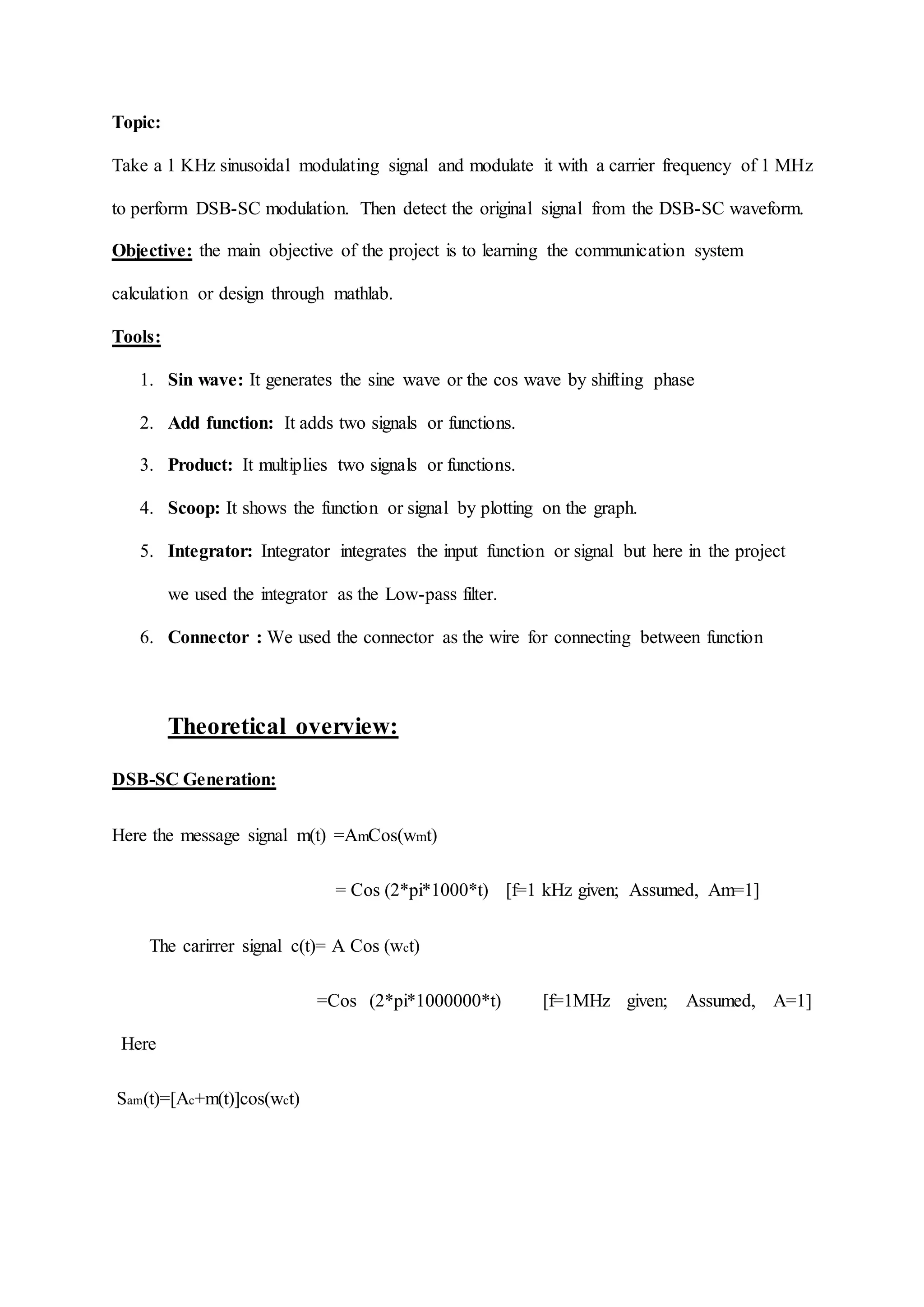 1. The document describes creating DSB-SC modulation and demodulation in MATLAB. A 1 kHz message signal is modulated with a 1 MHz carrier signal to perform DSB-SC modulation.